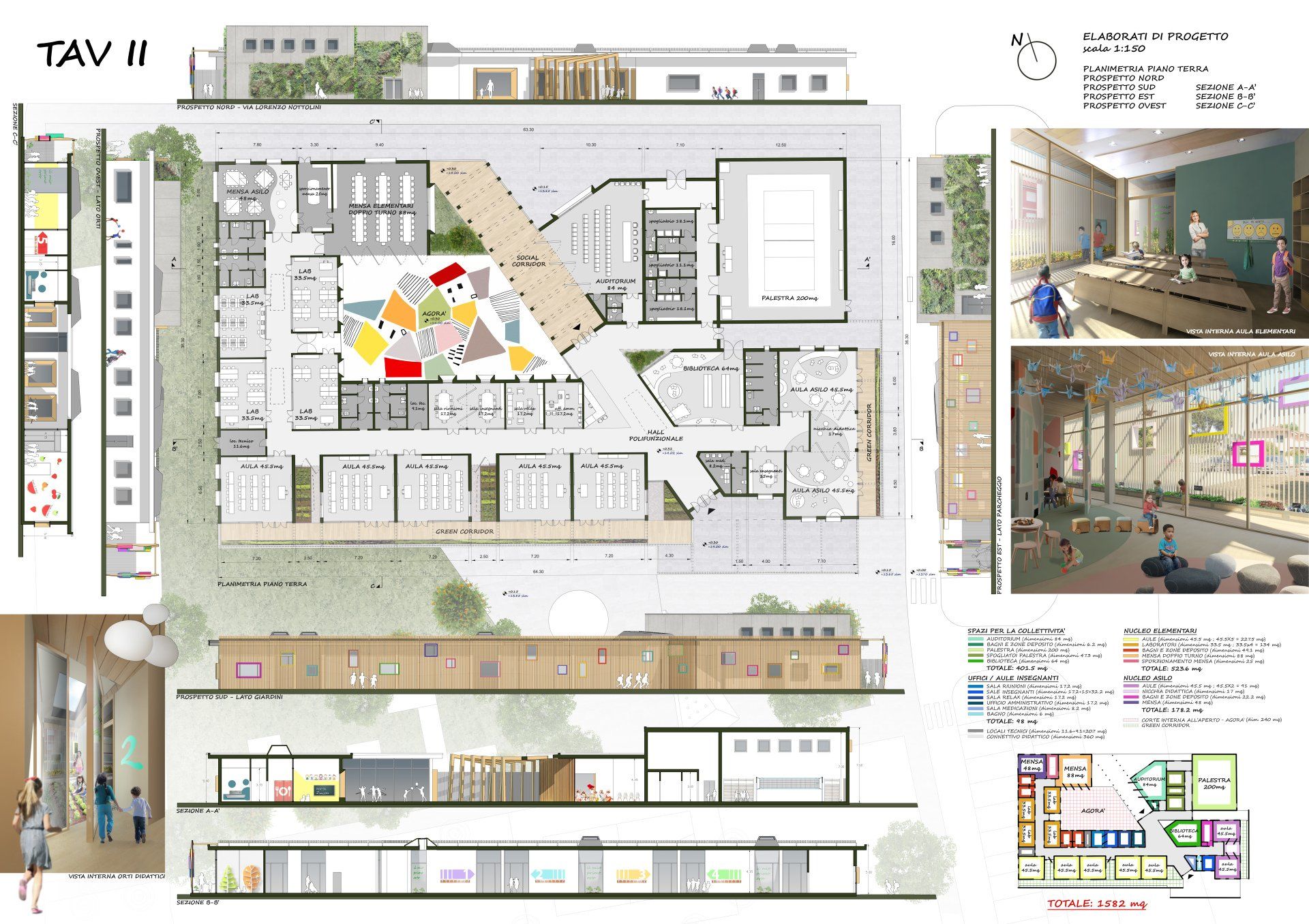 Per raggiungere tali obbiettivi è stato necessario pensare di progettare un ambiente su misura per gli utilizzatori, con schema distributivo e funzionalità consoni alla logica delle funzioni che dovrà ospitare. La semplicità della forma architettonica scelta per l’edificio consente di percorrerne l’interno in totale libertà: i riferimenti spaziali e distributivi sono percepibili dal nucleo centrale interamente vetrato dell’agorà, uno spazio destrutturato per l’attività sia ricreativa che didattica, a servizio della struttura polivalente, che può essere messo in comunicazione diretta con la stessa per piccole manifestazioni ed eventi.
