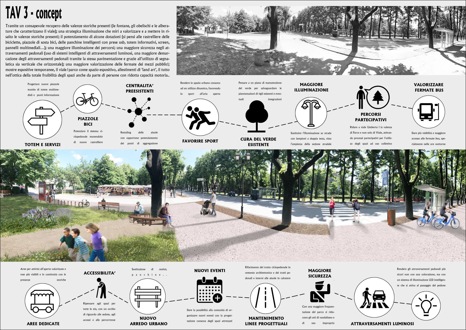 Il ridisegno delle aiuole si inserisce nell’ottica della valenza storica della passeggiata settecentesca riconoscibile proprio nel tracciato di viale Umberto I, all’epoca adorno di obelischi e fontane, e in continuità con i giardini della Reggia di Rivalta. Le aiuole, interamente rivisitate ed attraversate da vialetti, che nelle forme e incroci rievocano, in chiave moderna, i giardini all’italiana della Reggia di Rivalta, hanno un approccio compositivo di chiara matrice storica, segni e presenze che hanno l’intento di valorizzare e promuovere il sistema dei beni culturali estensi.